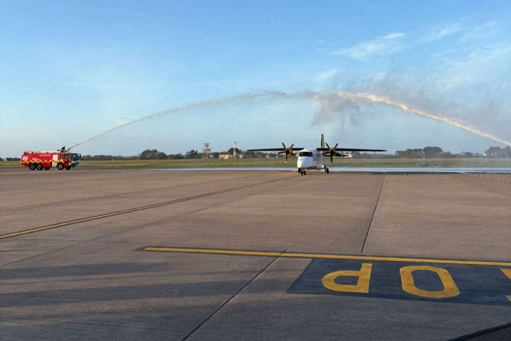 A water cannon salute greeted Captain John Morris, First Officer Harry Bell and passengers as the Dornier touched down in the Bailiwick for the last time.