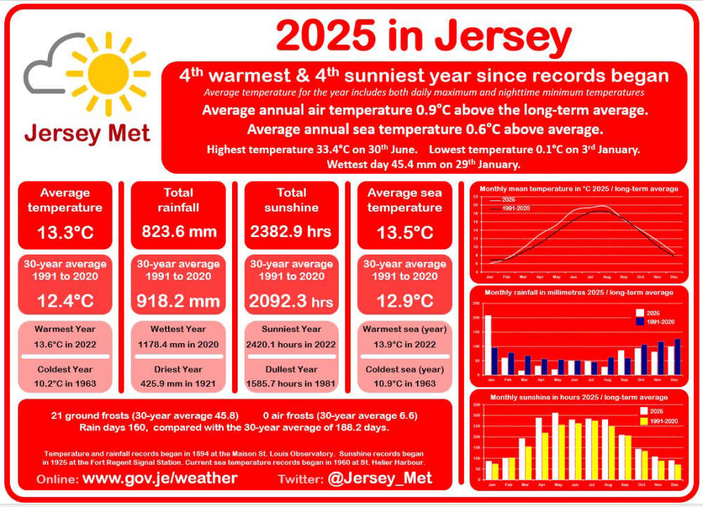 The warmest day was 30 June, with temperatures reaching 33.4°C, compared to 3 January, which recorded Jersey's lowest temperature, 0.1°C.