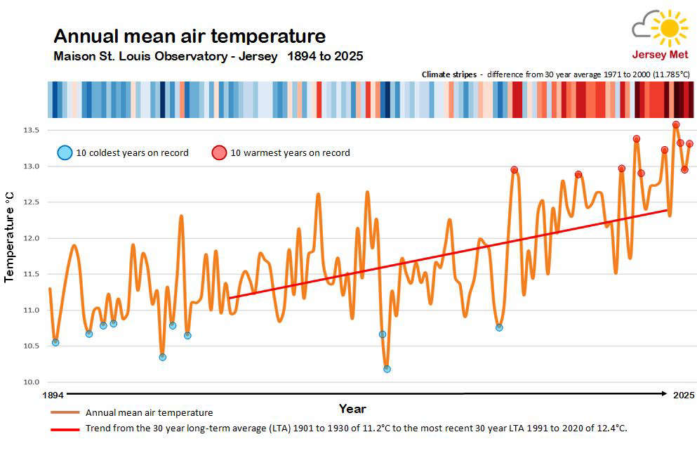 Jersey will see another dark red line added to the Climate Stripe mural, with 2025 marking the fourth warmest year on record.
