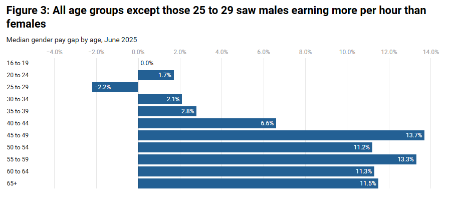 The gap is widest for people aged over 40, while 25-29 year-old women are the only age group earing more than men of the same age.